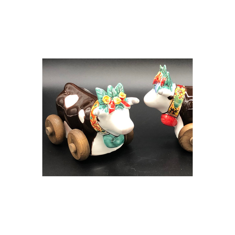 MINI MUCCA IN CERAMICA CM. 16 X 9 SMALTATA E DECORATA A MANO CON PARTI IN LEGNO DI FRASSINO