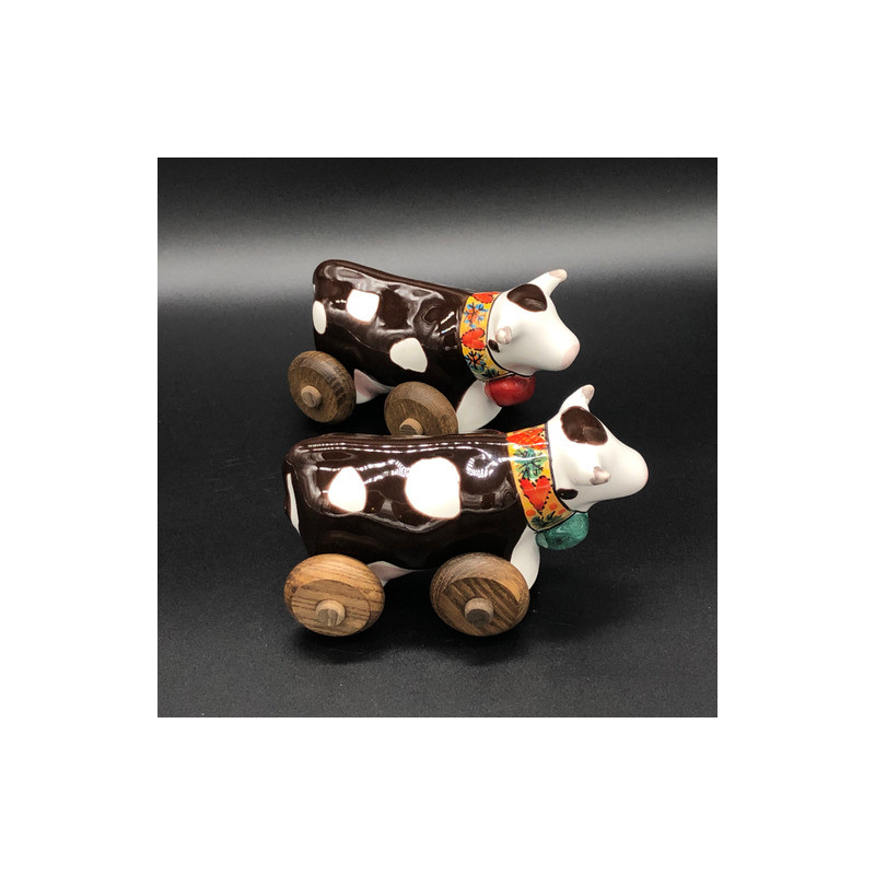MUCCA PICCOLA IN CERAMICA SMALTATA DECORATA A MAN0 CON PARTI IN LEGNO DI FRASSINO